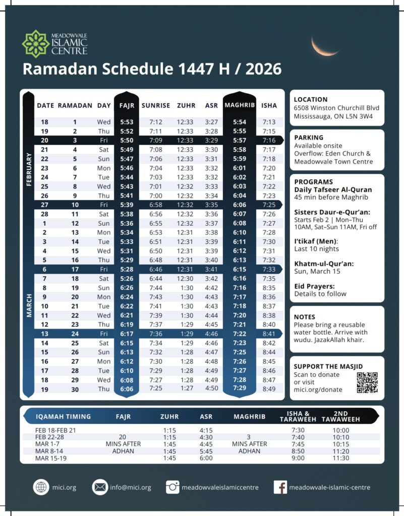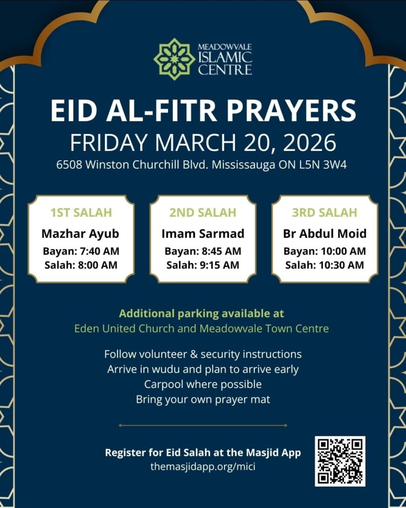 Meadowvale Islamic Centre (MIC) is a registered charitable organization with the Government of Canada under CRA Charity registration number 861881670RR0001.